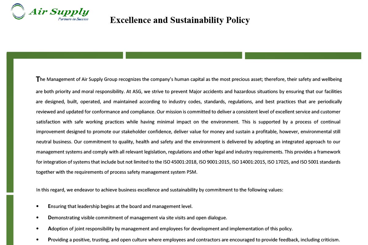 The slogan of Air Supply - a vast of gas related services and solutions in Egypt and MENA region through Air Supply’s strong international gas players’ partners and local reliable gas producers. Air Supply is to be the local gas leader in the region, providing our clients with the support to help them excel in their businesses